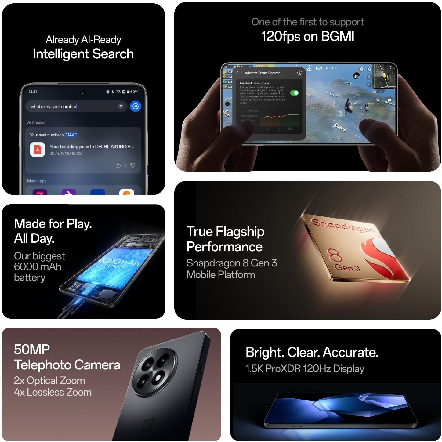 Operating System: Oxygen OS 15.0 based on Android 15 Platform: Snapdragon 8 Gen 3 Mobile Platform CPU: Qualcomm Kryo 980 CPU 3.3GHz GPU: Adreno 750 @903MHz RAM: 12GB/16GB LPDDR5X Storage: 256GB/512GB UFS 4.0 Battery: 6,000 mAh (single-cell 6,000 mAh, non-removable) Vibration: Haptic motor
